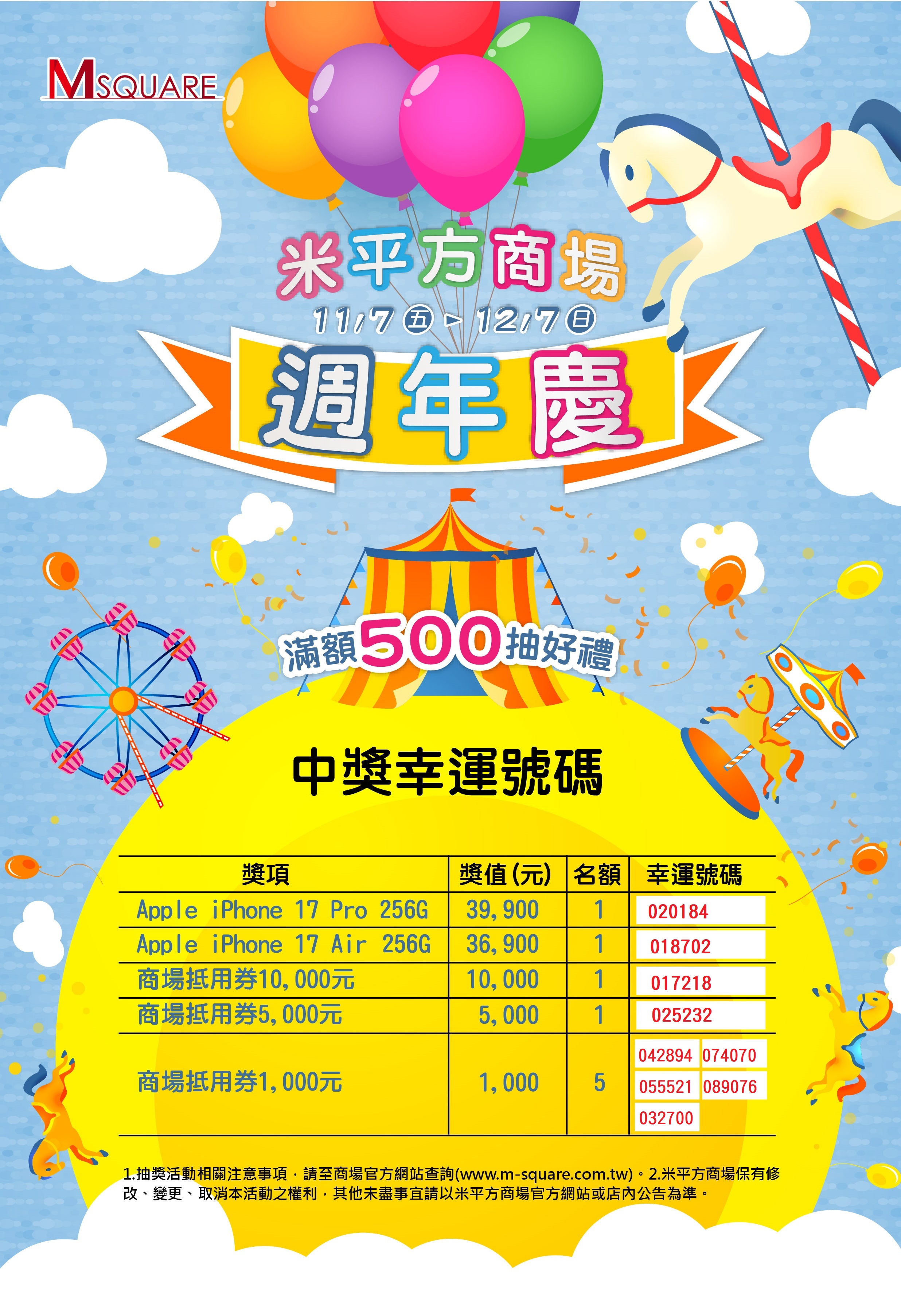米平方2025週年慶滿額500抽好禮 中獎幸運號碼