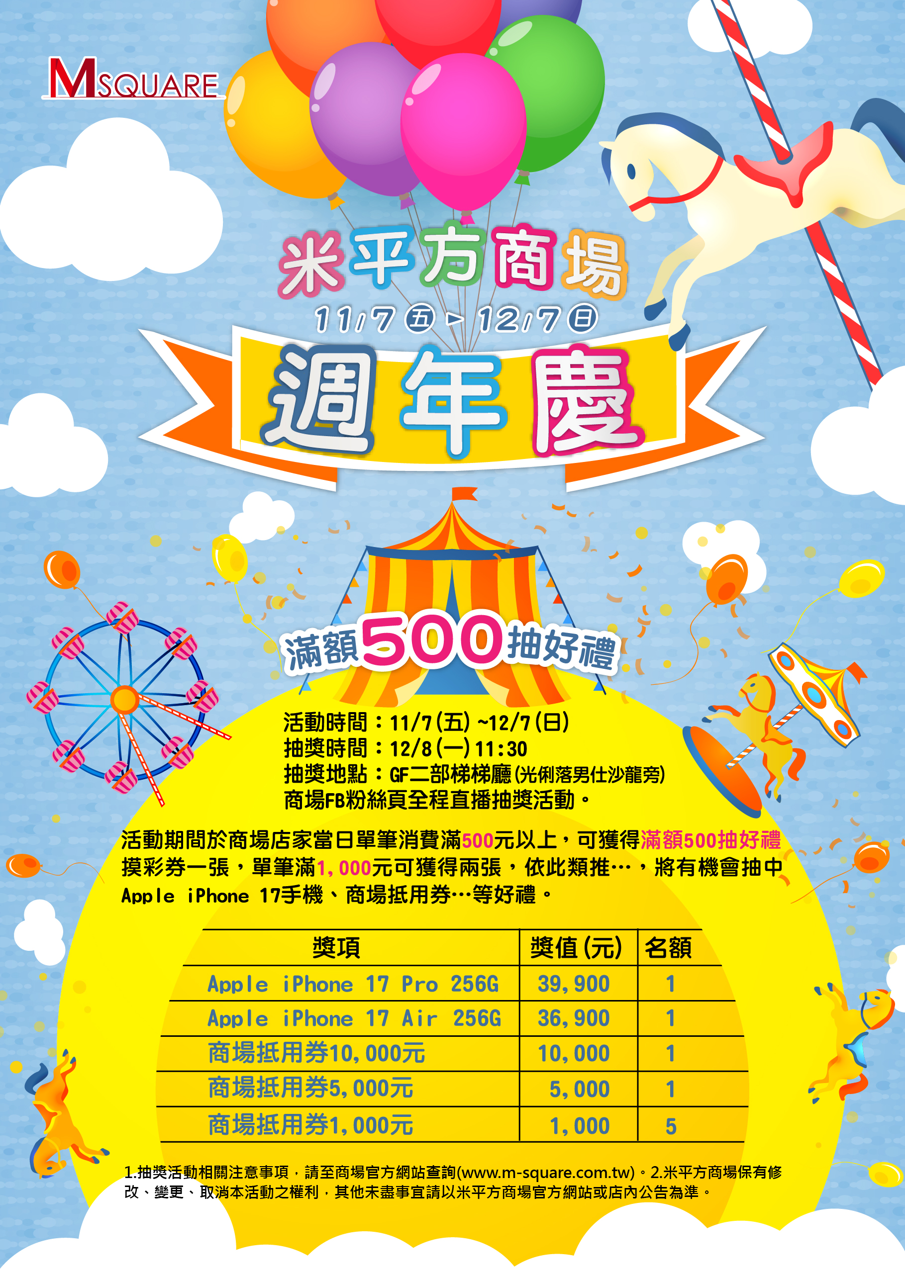 4. 本活動於12/8(一)抽獎結束當天,將得獎幸運號碼名單公佈於米平方商場官網www.m-square.com.tw及商場FB粉絲頁;中獎人請於2026/1/25(日)前,主動以電話方式與商場聯繫後續領獎事宜。